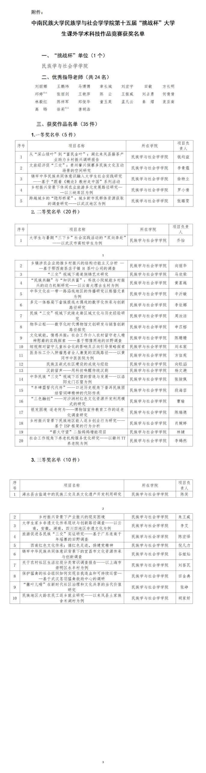 為引導和激勵學生通過廣泛的社會實踐、深入的社會觀察,不斷增強對國情社情民情的了解,激發創新精神,提升實踐能力,自中南民族大學第十五屆“挑戰杯”大學生課外學術科技作品競賽通知下發以來,我院黨委高度重視,團委積極動員組織,共35支學生團隊獲獎,其中錢均益、李青蔻、徐特立等5支團隊獲得一等獎;喬怡、向麗華、馬欣榮等10支團隊獲得二等獎;陳笑、朱王威、李艾等20支團隊獲得三等獎;陳祥軍、方長明、唐胡浩、王振威、馬博博等24位老師獲“優秀指導老師”榮譽稱號;學院榮獲“挑戰杯”單位榮譽稱號,全校僅我院獲得該榮譽稱號。(責編:袁亞南,審核:王璐璐,上傳:楊科)