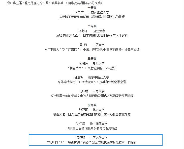 5月24日,第三屆“程之范醫(yī)史論文獎”頒獎活動在北京大學(xué)醫(yī)學(xué)部舉行,我院2021級歷史學(xué)專業(yè)本科生鄒筱琦的論文《X光片的“X”:魯迅肺病“誤診”疑云與現(xiàn)代醫(yī)學(xué)影像技術(shù)下的探研》榮獲優(yōu)秀獎。此次征文活動收到來自北京大學(xué)、清華大學(xué)、復(fù)旦大學(xué)、南京大學(xué)、上海交通大學(xué)等綜合類高校及科研院所以及倫敦大學(xué)學(xué)院、曼徹斯特大學(xué)、美國班尼迪克大學(xué)等國外高校的投稿。經(jīng)專家匿名評審,共評選出一等獎?wù)撐?篇,二等獎?wù)撐?篇,三等獎?wù)撐?篇,優(yōu)秀獎?wù)撐?2篇。鄒筱琦同學(xué)此次獲獎,是我院本科生首次獲得該獎項,是學(xué)院歷年來不斷加強本科人才培養(yǎng)、學(xué)術(shù)訓(xùn)練所取得的重要成果。