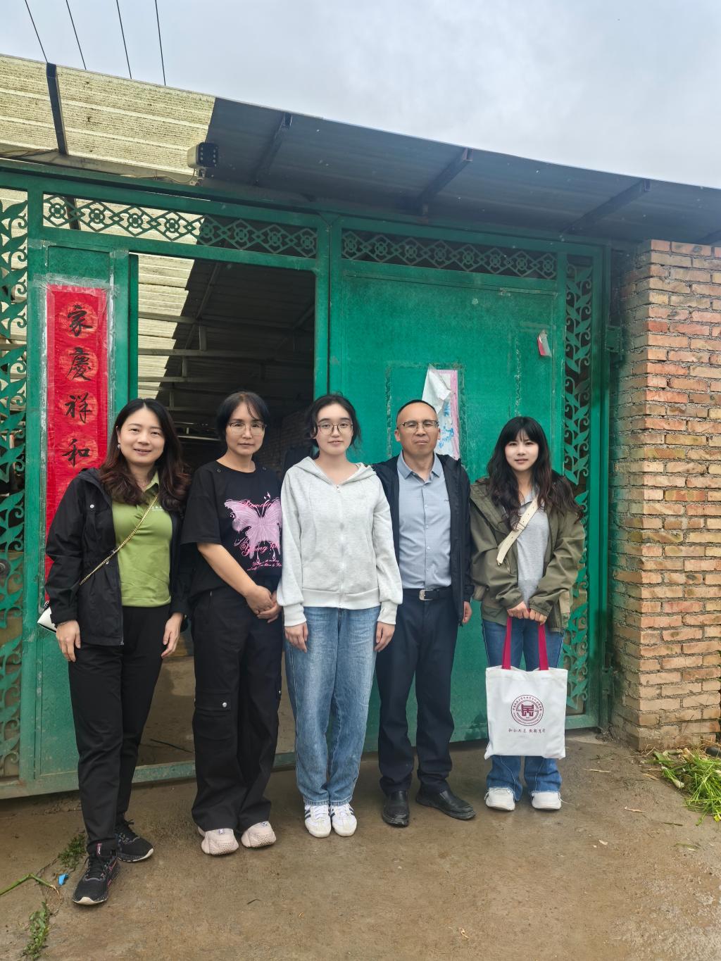 學院副書記王璐璐、研究生輔導員席鈺萍與張珍同學一家在家門口合影