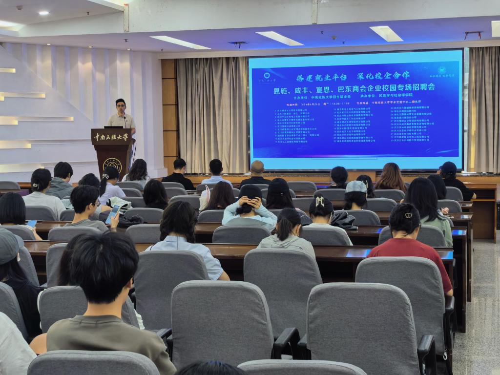 5月29日下午,由我校招生就業(yè)工作處主辦、民族學(xué)與社會(huì)學(xué)學(xué)院承辦的恩施、咸豐、宣恩、巴東商會(huì)企業(yè)校園專場(chǎng)招聘會(huì)系列活動(dòng)在我校學(xué)術(shù)交流中心二樓舉行,面向民社學(xué)院和我校應(yīng)屆畢業(yè)生開展公司宣講會(huì)和招聘活動(dòng)。