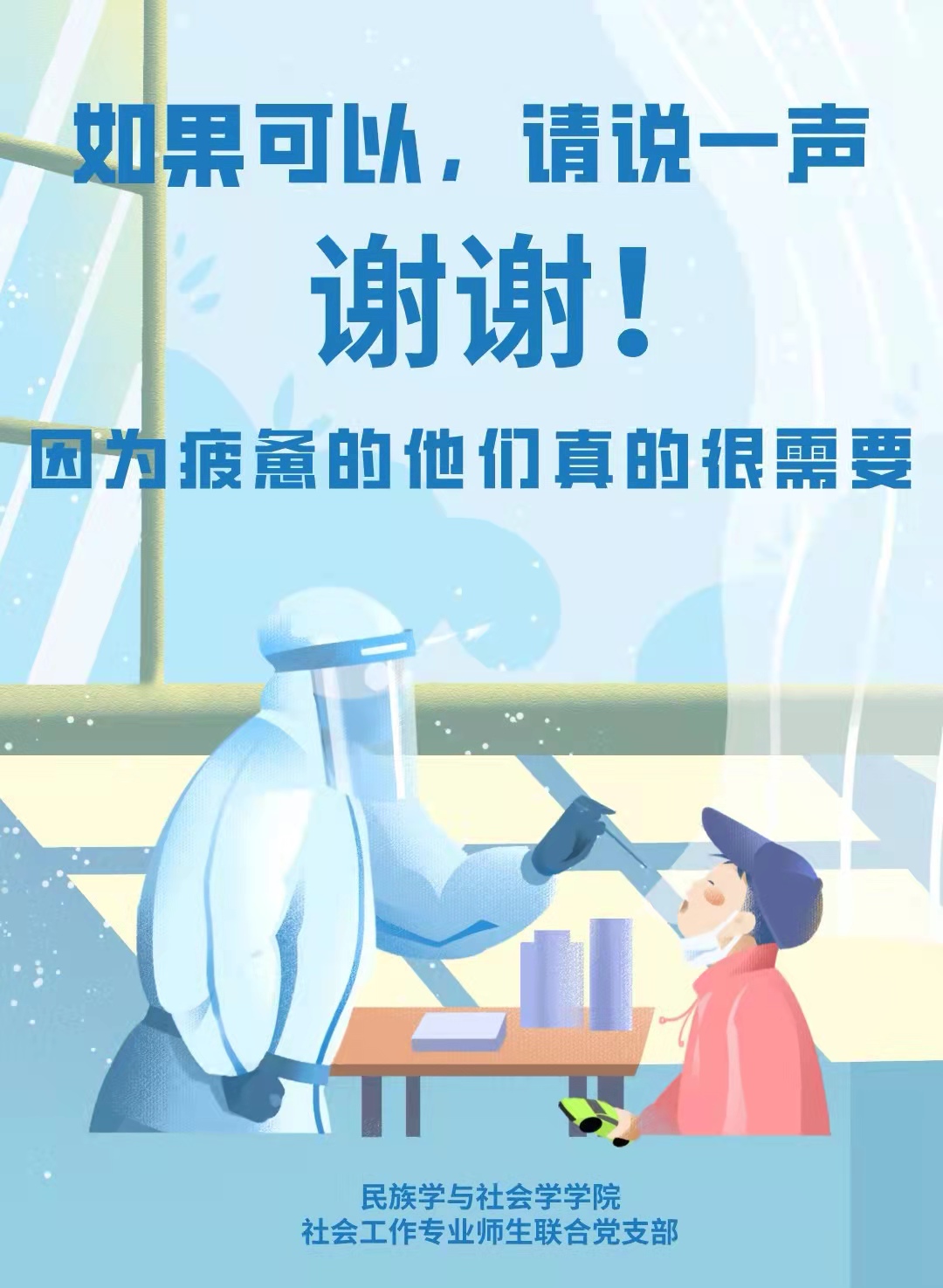 “謝謝你,社區工作者!”“謝謝你,白衣天使!”……為更好發揮社會工作專業優勢,助力疫情防控工作,4月10日,社會工作專業師生聯合黨支部組織黨員志愿者服務疫情防控,開展了“同心抗疫,感恩有你”黨員志愿服務活動,近20名黨員志愿者參加。