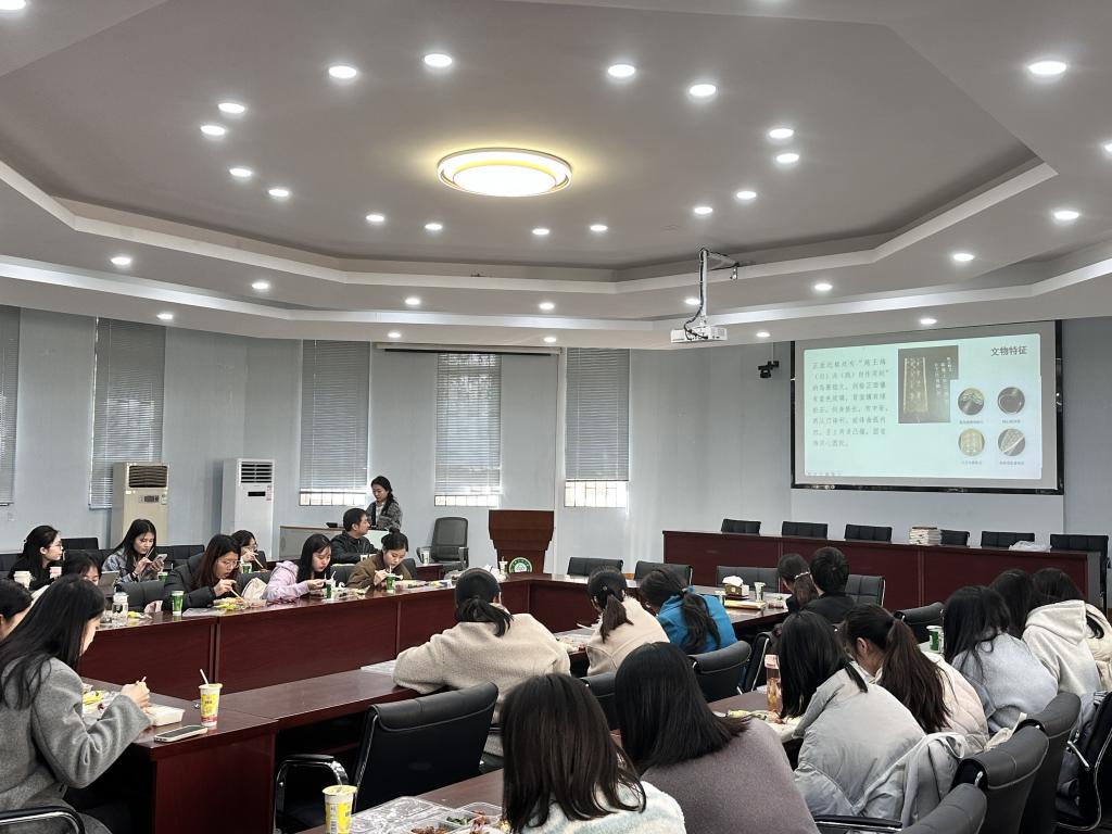 本次學習交流會以午餐會形式展開,圍繞湖北省博物館特色館藏文物,例如越王勾踐劍、虎座鳥架鼓、彩繪人物車馬出行圖等,由2024級民族學研究生劉星、羅小倩,2024級中國少數民族史研究生向筱毓、2022級民族學本科生吳雨陽、高月月和余影作為黨員代表分別報告發言,介紹文物的前世今生,分享學習心得。民族學專業教師黨支部王艷萍、馬惠娟、劉麗娜、范英杰四位老師予以點評指導。其中范英杰老師就向筱毓同志分享的越王勾踐劍內容特別強調,要結合民族學專業特色,透過文物本身的基礎信息,辯證思考其背后所蘊藏的民族歷史與文化內涵。