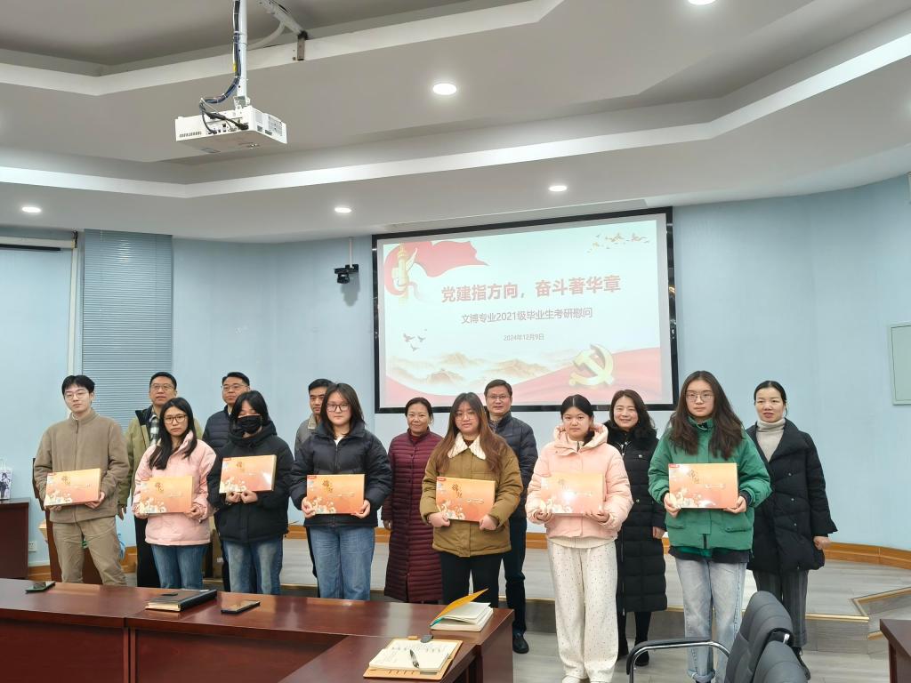 為幫助學(xué)生樹立備考信心,全力沖刺考研,12月9日上午,文博教研室、歷史文博專業(yè)教師黨支部在八角樓報告廳聯(lián)合開展了2021級文博專業(yè)本科生考研慰問活動。學(xué)院黨委書記錢文彬、副書記王璐璐、歷史文博專業(yè)教師黨支部書記鄭俊華、文博教研室全體教師及2021級輔導(dǎo)員出席,文博專業(yè)2021級考研同學(xué)參加此次活動。
