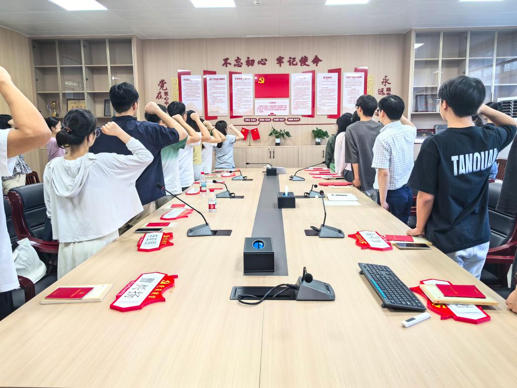 王璐璐宣讀了參加本次宣誓的預備黨員名單。錢文彬為新黨員發放黨徽、黨章、贈送《共產黨宣言》并授予“黨員寢室”牌,他強調“黨員寢室牌不僅是榮譽,更是監督。希望大家以寢室為陣地,用實際行動展現黨員先鋒模范作用。”隨后,全體預備黨員面向黨旗莊嚴宣誓。
