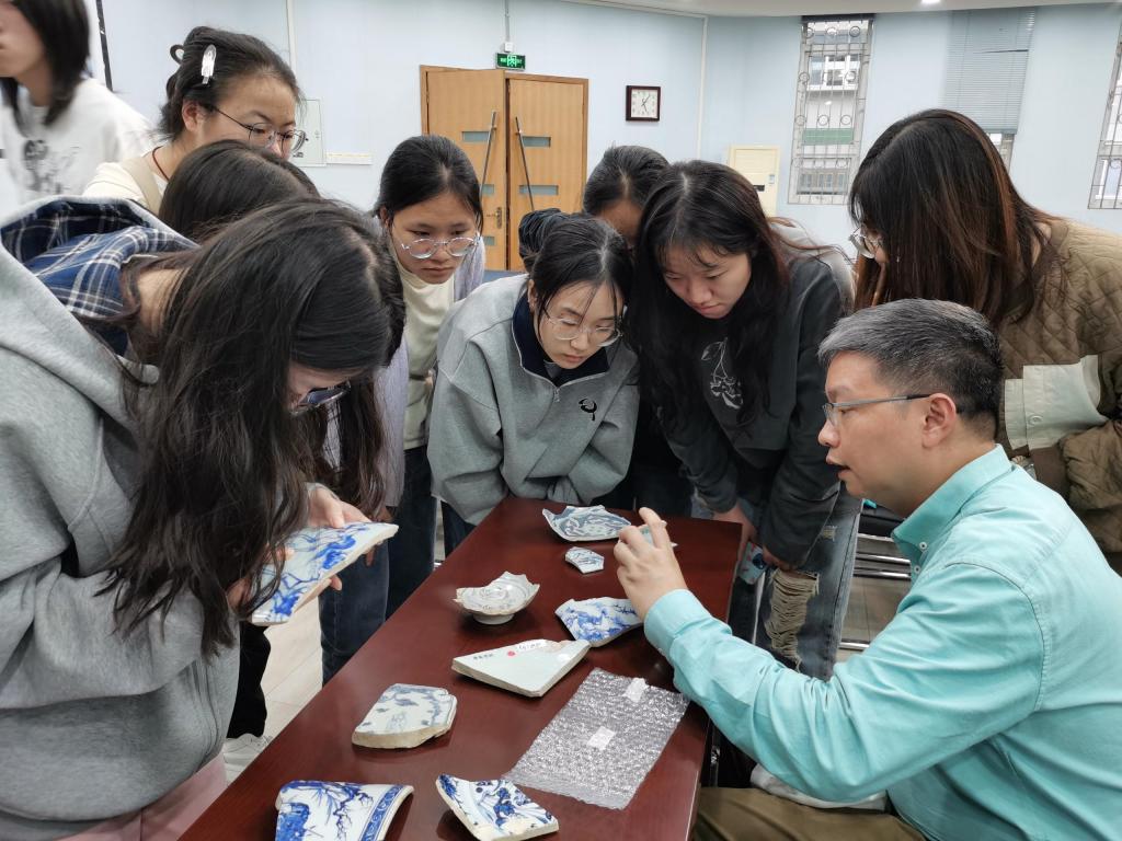 交流互動環節,黃清華向大家展示了部分元明清青花瓷器標本,讓同學們能夠近距離感受到青花瓷的歷史厚重感和藝術價值。面對同學們在青花瓷研究方面的疑問,黃清華一一耐心解答,現場氣氛活躍,交流深入。