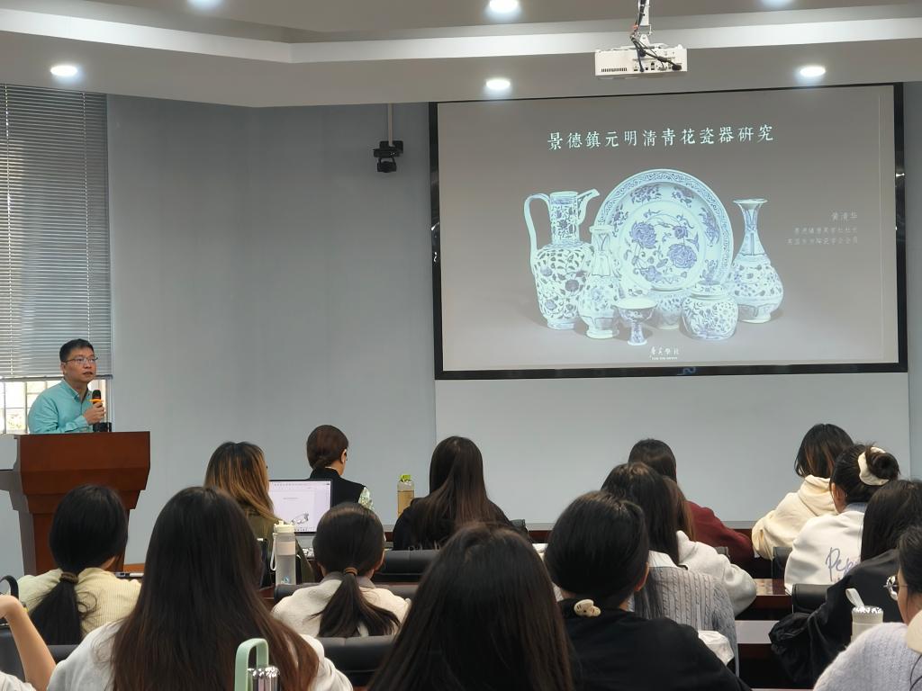 2024年11月12日,英國東方陶瓷學會會員、景德鎮唐英學社社長黃清華應邀做客澤霖講壇,在八角樓學術報告廳開展題為“景德鎮元明清青花瓷器研究”的講座。本次講座分為上下半場,分別由文博教研室庾華、高晶晶老師主持,陳祥軍院長、胡飛老師及文物與博物館學專業同學參加了講座。