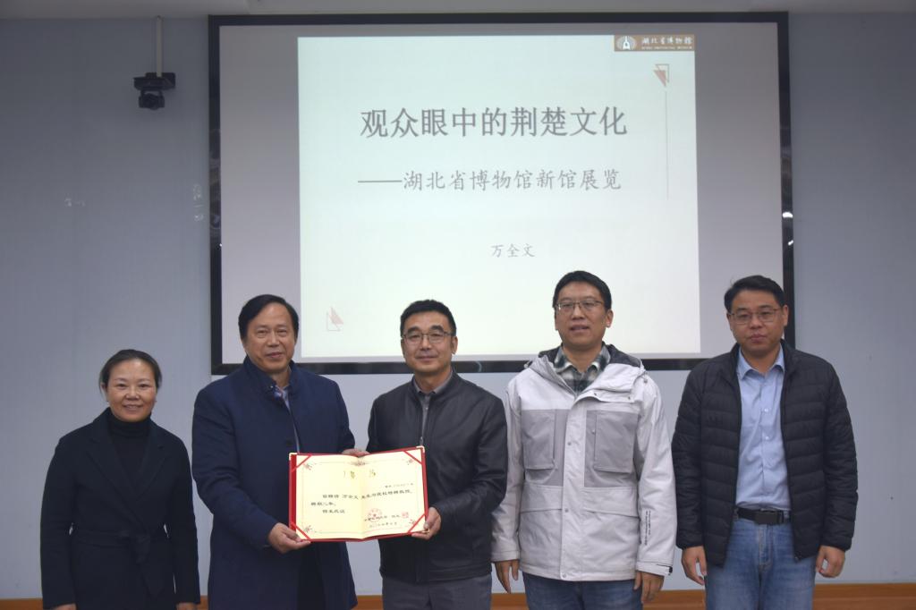 11月22日,湖北省博物館、湖北省文物考古研究所原黨委書記兼常務副館(所)長、二級研究館員、國務院特殊津貼專家萬全文應邀做客澤霖講壇,在八角樓學術報告廳開展題為“觀眾眼中的荊楚文化——湖北省博物館新館展覽”的講座。講座由文博教研室庾華教授主持,陳祥軍院長、高晶晶、胡飛老師及文博專業全體同學參加了講座。