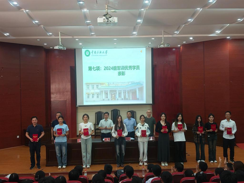 副院長方長明宣讀《關(guān)于表彰2024級軍訓(xùn)先進(jìn)集體和先進(jìn)個人的決定》,向我院十位獲得2024級軍訓(xùn)“優(yōu)秀學(xué)員”榮譽(yù)稱號的同學(xué)、獲得2024級軍訓(xùn)“優(yōu)秀指導(dǎo)員”榮譽(yù)稱號的袁磊老師表示祝賀。學(xué)院領(lǐng)導(dǎo)一同為他們頒發(fā)榮譽(yù)證書,鼓勵2024級新生在今后的學(xué)習(xí)生活中繼續(xù)發(fā)揚(yáng)“吃苦耐勞、不畏艱苦”的精神,成為“德智體美勞”全面發(fā)展的民社青年。