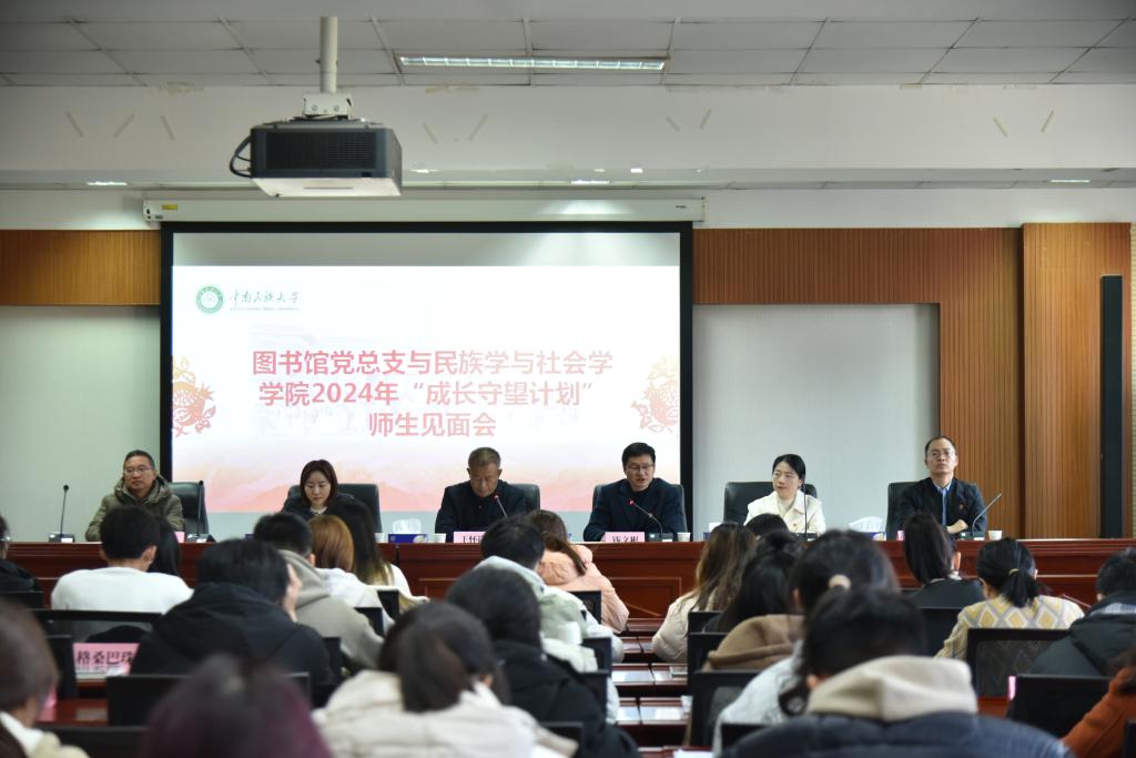 11月27日上午,圖書館黨總支與學院2024年“成長守望計劃”師生見面會在北書院澤霖學術講堂舉行。圖書館黨總支書記王懷崗、圖書館館長饒映雪、民族學與社會學學院黨委書記錢文彬、院黨委副書記王璐璐、學工辦副主任袁磊、“成長守望計劃”幫扶老師和入選同學參與本次會議。會議由王懷崗主持。