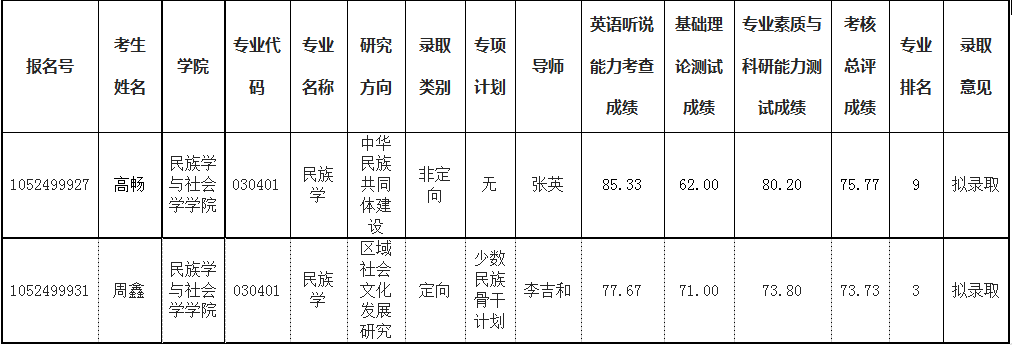 因我校其他學科少數民族骨干招生計劃未完成,學校決定將1個名額追加給民族學專業,經學院博士研究生招生領導小組研究同意,擬錄取周鑫為少數民族骨干專項計劃博士研究生?,F予公示。