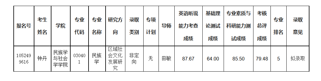 因報考民族學專業區域社會文化發展研究方向的考生周子翔放棄擬錄取資格,經民族學一級學科指導組研究決定,學院博士研究生招生錄取領導小組審批同意,擬錄取民族學專業區域社會文化發展研究方向考生鐘丹為博士研究生。特此公示。