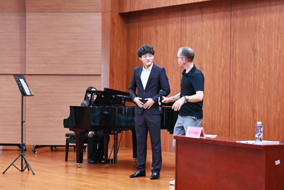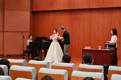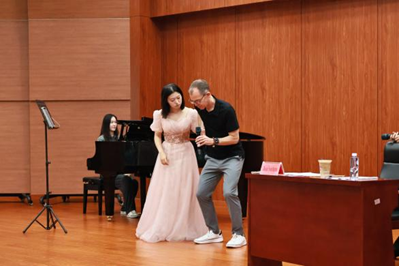 在教學方法研討過程中,我院本科、研究生學生田佳麗、賈浩、馬思南、殷雨欣四位學生先后登臺,分別演唱了聲樂《親切的名字》《負心人》《你發火,就愛生氣》《尤卡利》,薩瑟恩教授針對每位學生的演唱進行了單獨的指導,學生們在現場呈現出明顯的變化,引得現場爆發陣陣掌聲。薩瑟恩教授就如何更好地運用氣息并通過氣息控制增強音色層次與戲劇表現力進行了講解示范,令在場師生深受啟發。