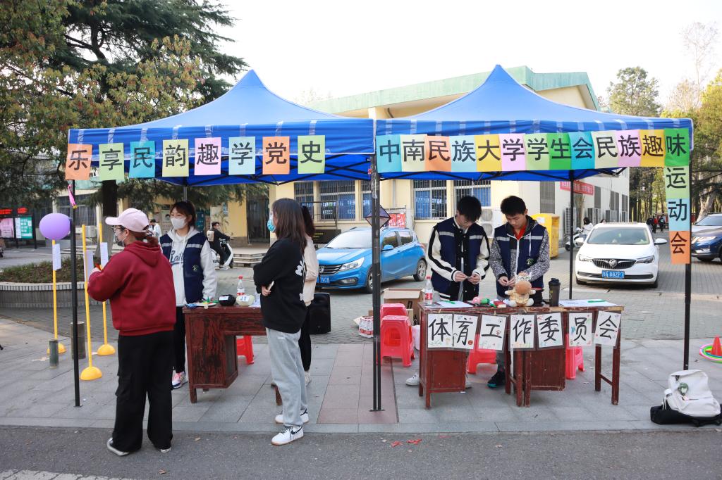 3月24日-25日,中南民族大學學生會于南區一、二食堂之間開展了“樂享民韻·趣學黨史”民族趣味運動會擺臺宣傳活動。