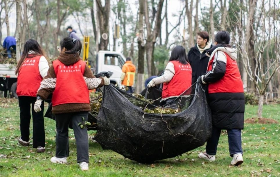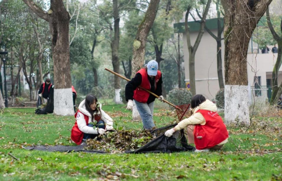 在南湖園和南區三、四食堂等附近的道路上,團員們和志愿者們身穿紅色馬甲,配合緊密,合理劃分區域。他們搬移擋住路面的樹枝,用鐵鍬鏟冰除雪,清掃路面,一推、一鏟、一掃,路面的殘雪、冰渣以及掉落的樹枝全部得以清除。