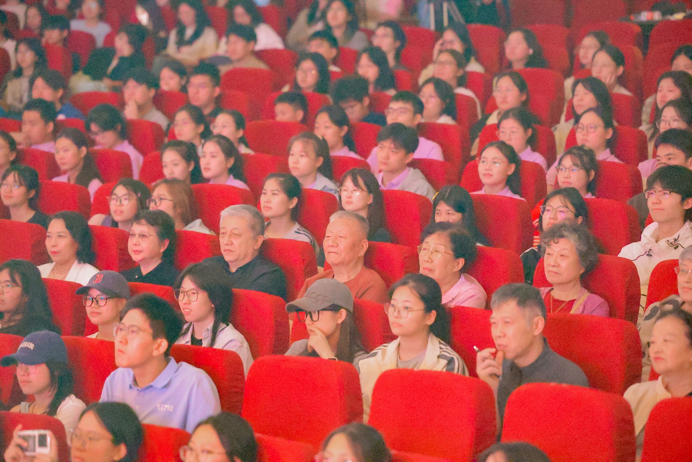 當日下午,大禮堂內莊重溫馨。白瑞西先生家屬、新進教職工代表、研究生支教團全體在校學生、部分教師和學生代表共同觀看首場演出。在戲劇藝術的沉浸演繹中,青年教師們溯源師者初心,感悟教育使命。教育家家屬的到場,讓歷史敘事更顯真實厚重,為現場觀眾搭建起跨越時空的精神對話。當晚,新生專場在大禮堂開啟。話劇通過直播形式同步呈現于南湖中心運動場,2025級新生共同觀看了這場特殊的“大思政課”。
