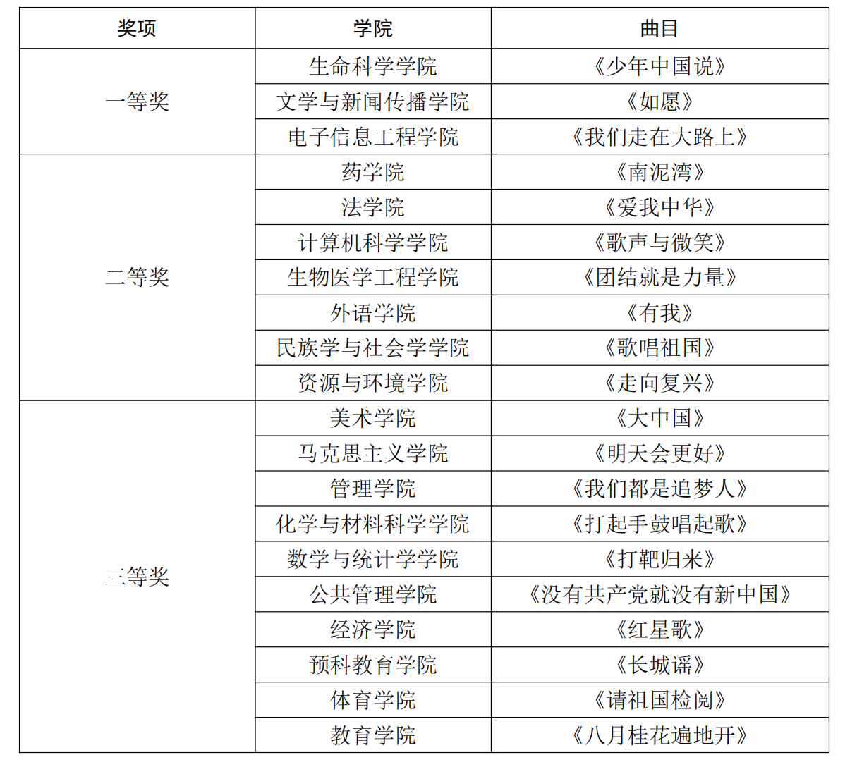 根據《關于舉辦中南民族大學慶祝新中國成立75周年 “和美中南 合鑄中華”青春歌會的通知》(民大黨發〔2024〕60號)的相關安排,學校于2024年9月28日舉辦了“和美中南 合鑄中華”青春歌會暨2024年迎新晚會,共有20支隊伍參賽。經現場表現得分以及網絡投票排名得分(所占比重分別為90%、10%,總分100分)綜合排名,現將比賽最終結果通報如下: