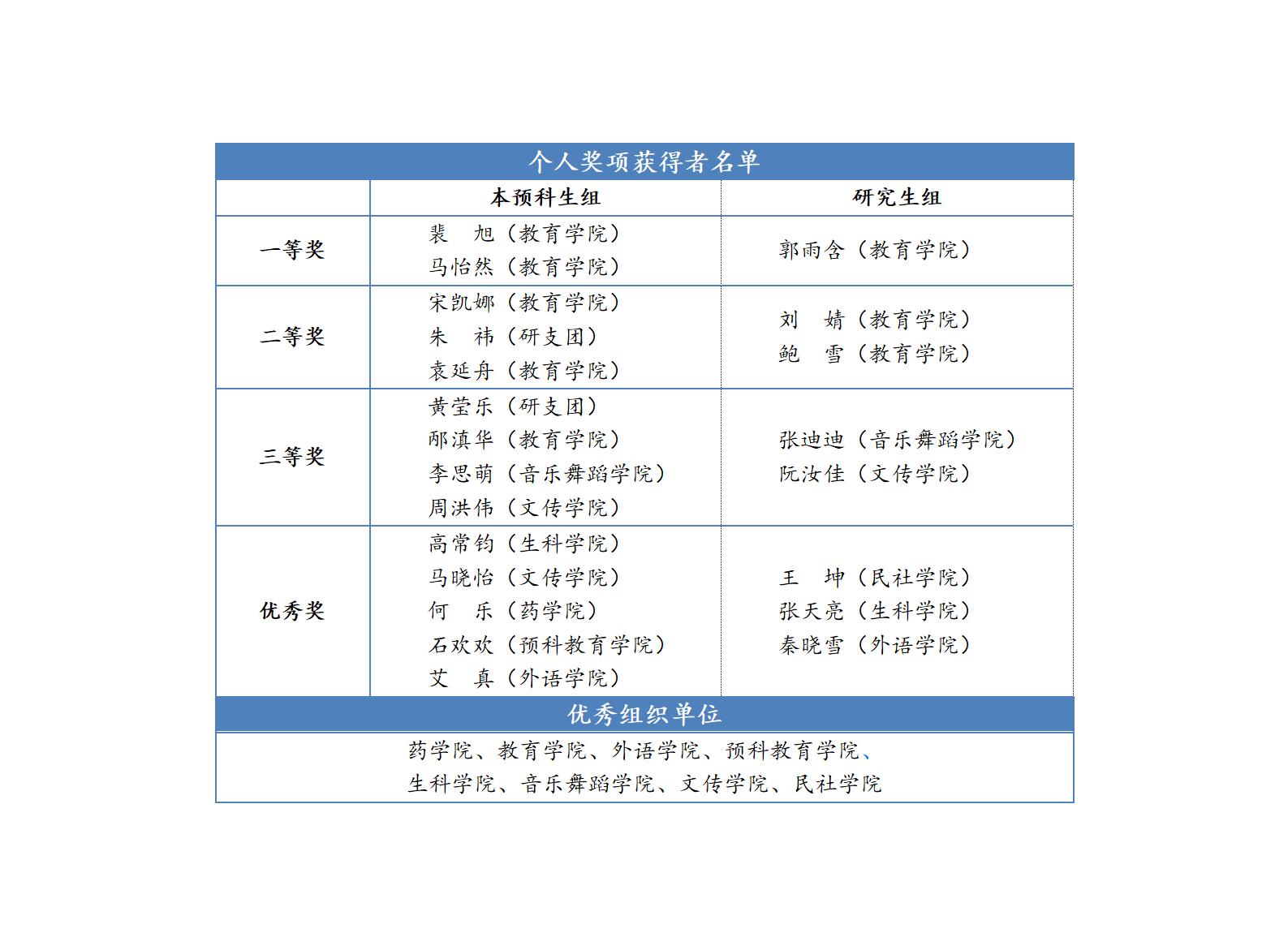 決賽共分上下兩場,上半場為本預科生比賽專場,下半場為研究生比賽專場。22位參賽選手選題突出專業特色,以獨特的教學設計、流暢的講課過程和靈動的語言表達在短短的8分鐘里展現了教學的新思路和新方法,呈現出了良好的課堂效果。教學內容豐富多彩,涉及小學、初中、高中多學段,《有余數的除法》《盤古開天地》《認識時間》《情緒萬花筒》《水循環》《細胞核的結構和功能》《多彩的鄉音》等課堂涵蓋語文、數學、英語、音樂等多學科知識。最終,裴旭、馬怡然獲本預科生組一等獎,郭雨含獲研究生組一等獎。