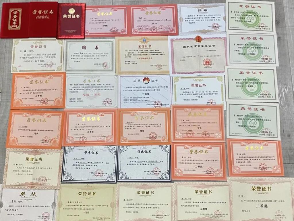 大學(xué)四年里,肖榆的綜合成績名列前茅,斬獲了國家獎學(xué)金,專業(yè)一、二等獎學(xué)金,社會工作獎學(xué)金,榮獲“三好學(xué)生”、“創(chuàng)新創(chuàng)業(yè)標(biāo)兵”、校團(tuán)委“優(yōu)秀學(xué)生干部”等榮譽(yù)稱號。在競賽中,他獲得各類獎項(xiàng)40項(xiàng),包括國家級獎項(xiàng)2項(xiàng),省級獎項(xiàng)7項(xiàng),院校級獎項(xiàng)31項(xiàng),其中由肖榆擔(dān)任負(fù)責(zé)人的全國大學(xué)生計(jì)算機(jī)設(shè)計(jì)大賽(數(shù)媒與交互設(shè)計(jì))獲得國家二等獎,第七屆“互聯(lián)網(wǎng)+”大賽獲省級金獎。
