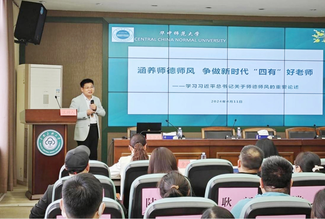 華中師范大學(xué)歷史文化學(xué)院分黨委書記李華忠以《涵養(yǎng)師德師風(fēng) 爭做新時代“四有”好老師》為題,分析了當(dāng)前師德師風(fēng)建設(shè)的形勢,詳細(xì)講解了新時代黨和國家對教師師德師風(fēng)的要求,以及當(dāng)前師德師風(fēng)存在的典型問題。他強(qiáng)調(diào)廣大教師要遵循教書育人規(guī)律、學(xué)生成長規(guī)律,在“培養(yǎng)什么樣的人、如何培養(yǎng)人以及為誰培養(yǎng)人”的問題上旗幟鮮明,做到以德立身、以德立學(xué)、以德施教,為培養(yǎng)德智體美勞全面發(fā)展的社會主義建設(shè)者和接班人作出貢獻(xiàn)。