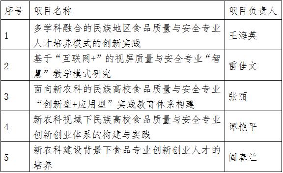 8月27日,教育部高等教育司公示了關于新農科研究與改革實踐項目擬立項名單,擬對407個新農科研究與改革實踐項目予以立項。我院承擔的5個項目主要研究方向是新型農林人才培養改革實踐,主要以涉農專業食品質量與安全為依托平臺。