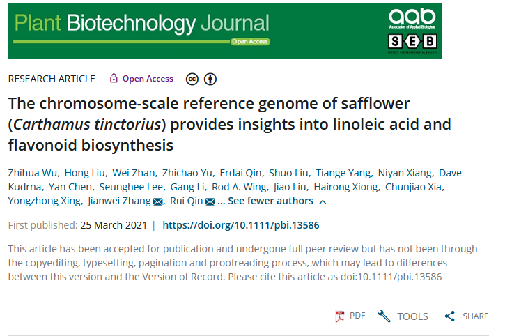 近日,中南民族大學生命科學學院覃瑞團隊聯合華中農業大學作物遺傳改良國家重點實驗室張建偉與邢永忠課題組在Plant Biotechnology Journal發表“The chromosome-scale reference genome of safflower (Carthamus tinctorius) provides insights into linoleic acid and flavonoid biosynthesis”的研究論文。
