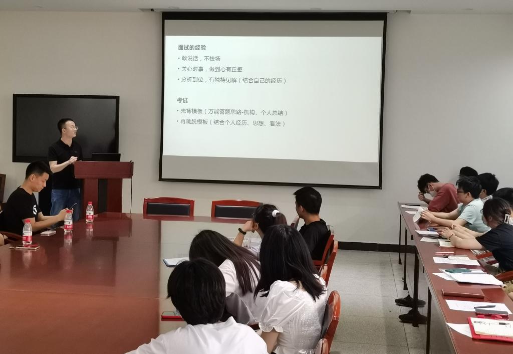 優秀畢業生徐宵粲和高云分享了自己的考博經歷、考前準備、面試心態、聯系導師等方面的經驗;優秀畢業生陳歡和王帥分享了自身的求職經歷,并總結了投簡歷、面試、找工作等各環節技巧;優秀畢業生王政從自己考公務員的經歷出發,分享了公務員考試復習、筆試、面試等環節的注意事項和經驗。在互動環節中,研究生積極提問,而畢業生代表們也熱情地給予了回復與建議。參會研究生紛紛表示受益匪淺,對自己未來的去向也有了更為清晰的了解和認識,明確了自己的努力方向。