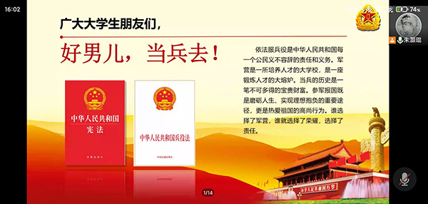 為加強(qiáng)青年大學(xué)生國(guó)防教育,切實(shí)做好征兵政策宣傳工作,鼓勵(lì)引導(dǎo)學(xué)生積極應(yīng)征入伍,生科學(xué)院征兵動(dòng)員線上大會(huì)于12月15日下午舉行。學(xué)院黨委副書記楊征,輔導(dǎo)員朱灝琨,退伍學(xué)生代表李帥帥、楊卓,以及2018級(jí)全體學(xué)生和部分低年級(jí)學(xué)生參加了此次動(dòng)員大會(huì)。