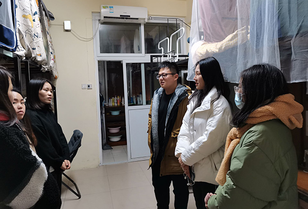 在學生寢室,老師們詳細詢問了同學們目前的學習生活情況,以及大家離校回家的具體時間,重點關注了同學們的疫情防控落實情況和假期安排,著重提醒學生一定要注意人身和財產安全。老師們要求大家遵守疫情防控政策、落實相關要求和規定,并加強體育鍛煉保持身體健康;經常與家人、朋友聯系,保持良好的心理狀態;嚴格遵守學校相關規章制度,有任何問題和困難及時與老師聯系。