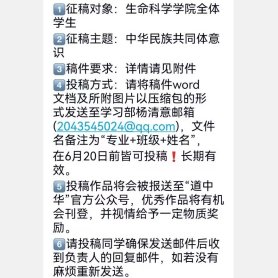 為深入學習宣傳貫徹黨的二十大精神和中央民族工作會議精神,教育引導各民族大學生堅守中華文化立場,聚焦鑄牢中華民族共同體意識主線,同時為選拔優秀學生代表參加學校舉辦的首屆“道中華”杯演講比賽,生命科學學院全院高度重視此次活動,在本科生和研究生中宣傳動員學生積極參與,認真準備。