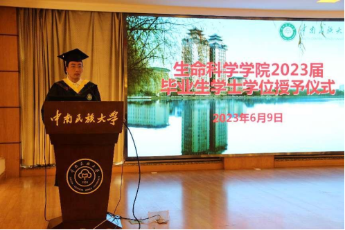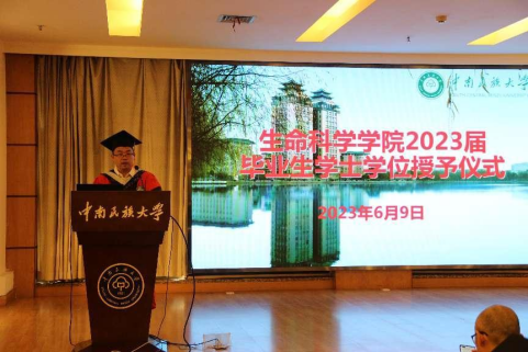 6月10日下午,生命科學學院2023屆本科畢業生畢業典禮暨學位授予儀式在潤良報告廳舉行。副校長杜冬云、院黨委書記謝嵐、院長余光輝、院黨委副書記邵國良、副院長譚艷平、畢業班輔導員方文杰和李泳璋老師、畢業班班導師、院黨政辦公室主任江華芳老師和學工辦主任李茜老師出席儀式。