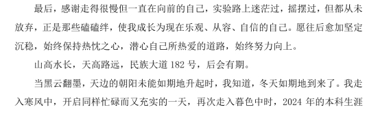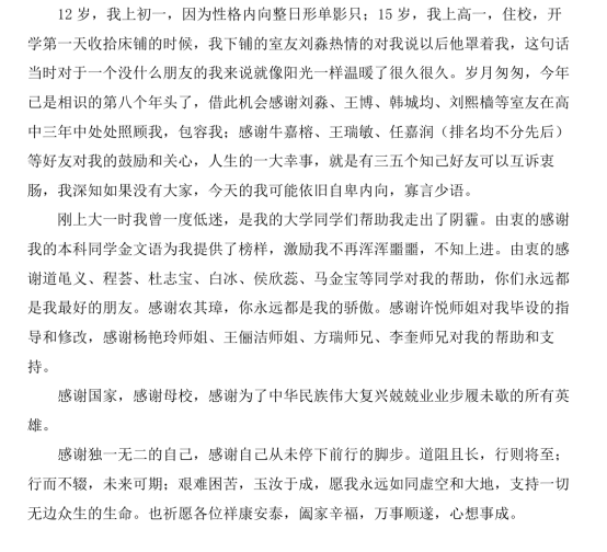 我要感謝一直努力奮斗,不放棄不低頭、樂觀的自己,人生總是會有很多遺憾和不如意,抬起頭向前看,海壓竹枝低復舉,風吹山角晦還明。愿未來的我能夠依舊真誠、堅定,心懷感恩,不要忘記來時的路,即使被撞得頭破血流也不失繼續下去的勇氣。