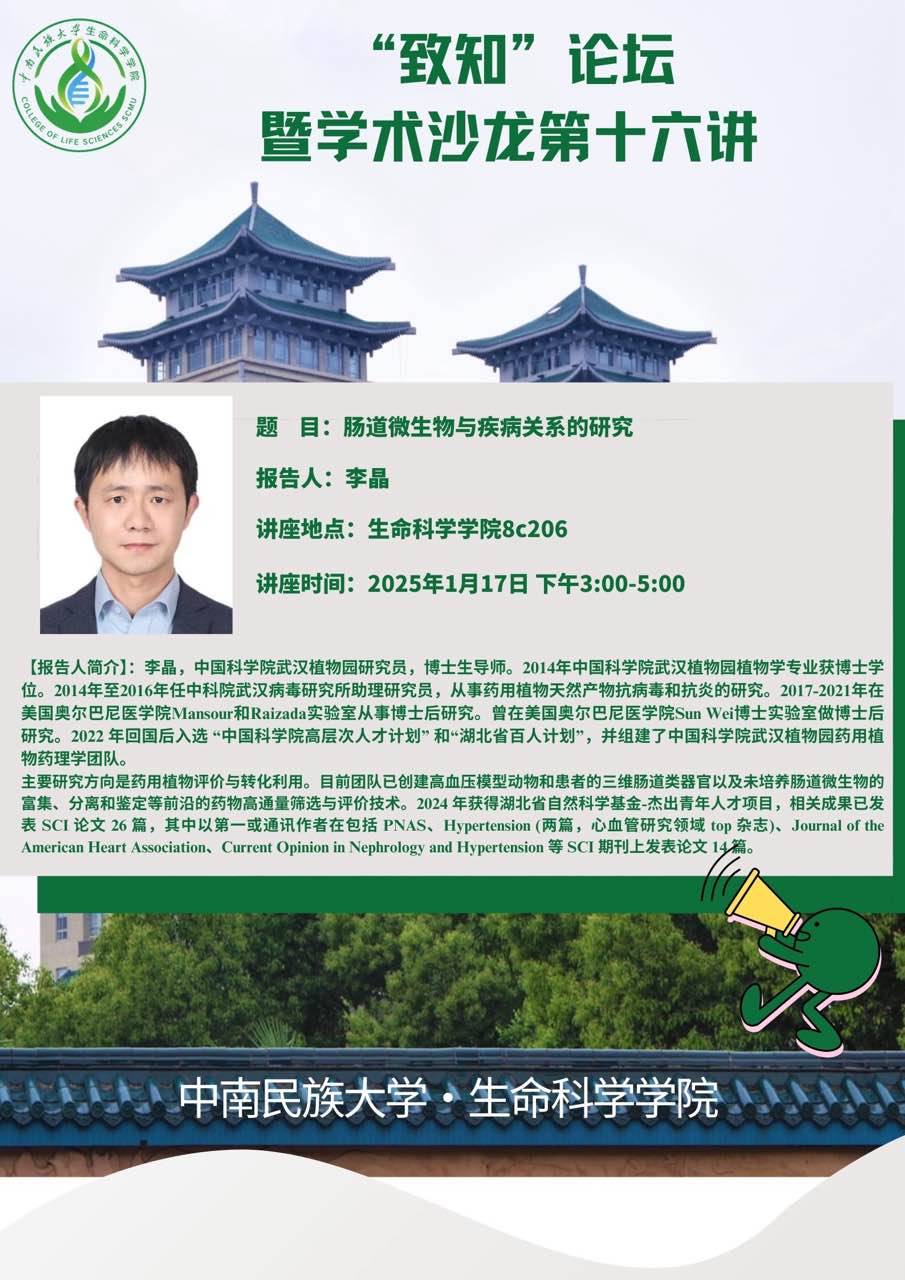 2025年1月17日,學院于8C206會議室舉辦“致知”論壇暨學術沙龍第十六講活動。本次活動邀請中國科學院武漢植物園李晶教授來作學術講座,題為“腸道微生物與疾病關系的研究”,本次活動由院長覃永華主持,由學院相關學科方向的教師及研究生參會聽取報告并進行學習。