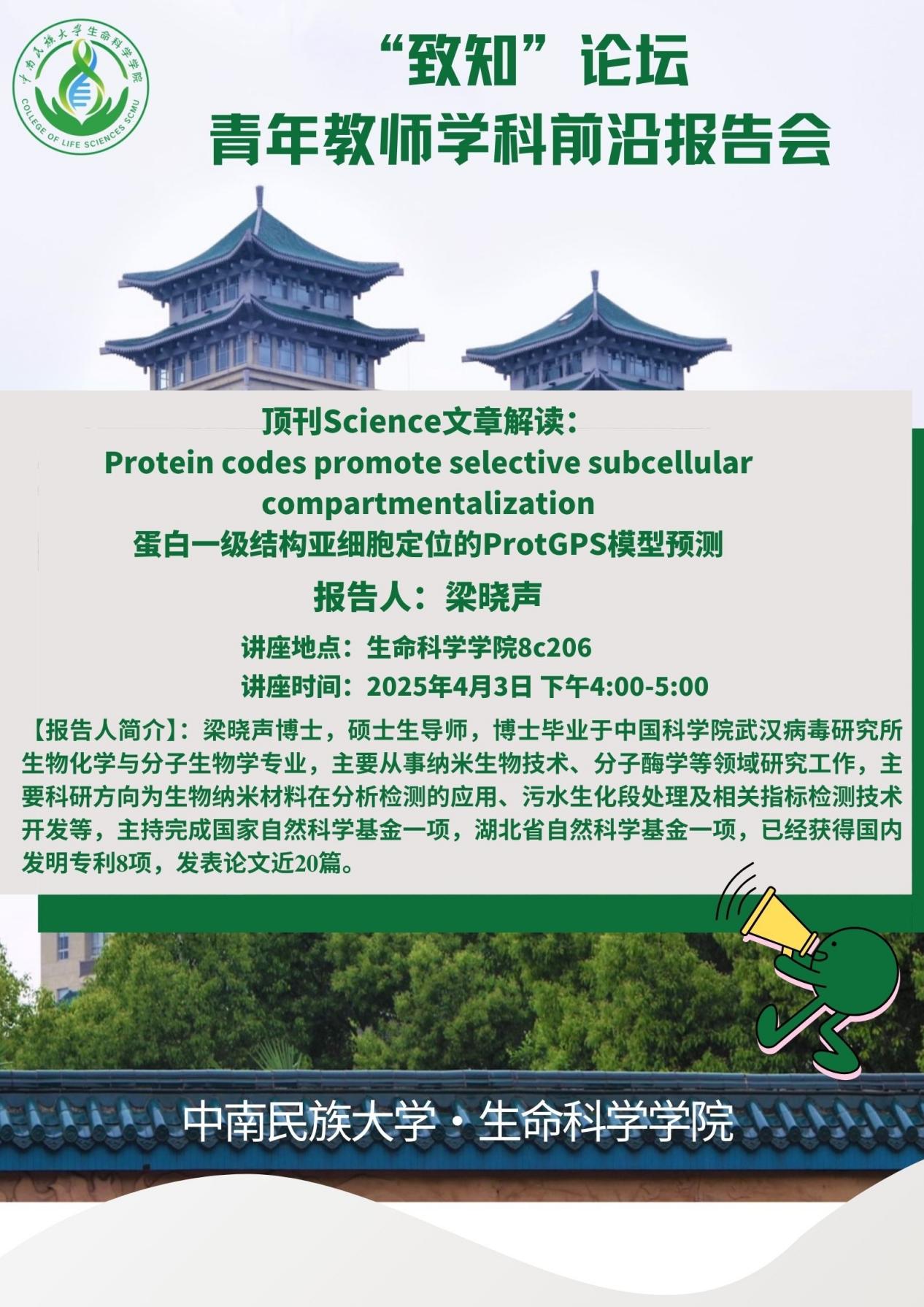 2025年4月3日,學院在8C206會議室舉辦“致知”論壇青年教師學科前沿報告會。本次活動邀請生命科學學院梁曉聲博士主講,題為”頂刊Science文章解讀:“Protein codes promote selective subcellularcompartmentalization“。活動由院長余光輝主持,學院相關學科方向的教師及研究生參加。