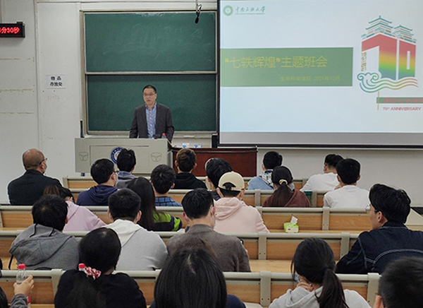 座談中,宋發軍與同學們進行了深入交流。他從我校的校史談起,詳細介紹了學校的起源與歷史背景、建校以來的重要時間節點和大事記,并結合自身的親身經歷,為同學們介紹了生科學院的發展歷史。他表示,生科學院是一個具有歷史底蘊的學院,發展至今在所有師生的共同努力下取得了有目共睹的成績,他鼓勵學生努力學習,在未來用自身的成就為學校與學院增光添彩。