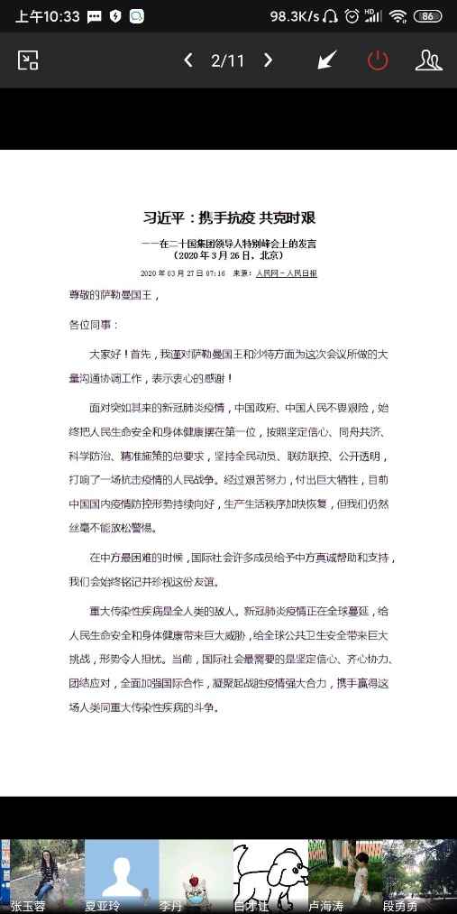 為深入學習貫徹習近平總書記就統籌推進疫情防控和經濟社會發展工作重要講話精神,全面貫徹黨中央、國家民委黨組和湖北省委各項決策部署,做好統籌推進新冠疫情防控和學校各項事業發展工作。張玉蓉同志組織大家先后學習了近期的五個文件,分別是《黨委(黨組)落實全面從嚴治黨主題責任規定(3月9日)》、《習近平:攜手抗疫 共克時艱—在二十國集團領導人特別峰會上的重要講話(3月26日)》,以及《學習貫徹習近平總書記浙江考察重要講話精神(3月29日-4月1日)》和《習近平給武漢東湖新城社區全體社區工作者的回信(4月9日)》,最后學習了《中共中央政治局召開會議 分析國內外新冠肺炎疫情防控形勢 研究部署抓緊抓實抓細常態化疫情防控工作 分析研究當前經濟形勢和經濟工作 中共中央總書記習近平主持會議(4月17日)》。