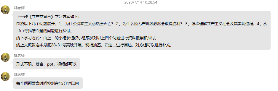 活動(dòng)前期姚老師按專業(yè)將26位同學(xué)分為兩個(gè)小組,每個(gè)小組13人,各小組就姚亞南老師給出的四個(gè)問題進(jìn)行資料收集和學(xué)習(xí)探討,并將小組的學(xué)習(xí)成果進(jìn)行線上分享。問題的內(nèi)容分別是:為什么資本主義必然會(huì)滅亡?為什么說無產(chǎn)階級必然會(huì)取得勝利?怎樣理解共產(chǎn)主義社會(huì)及其實(shí)現(xiàn)過程?從《共產(chǎn)黨宣言》一書中尋找感興趣的問題進(jìn)行探討。