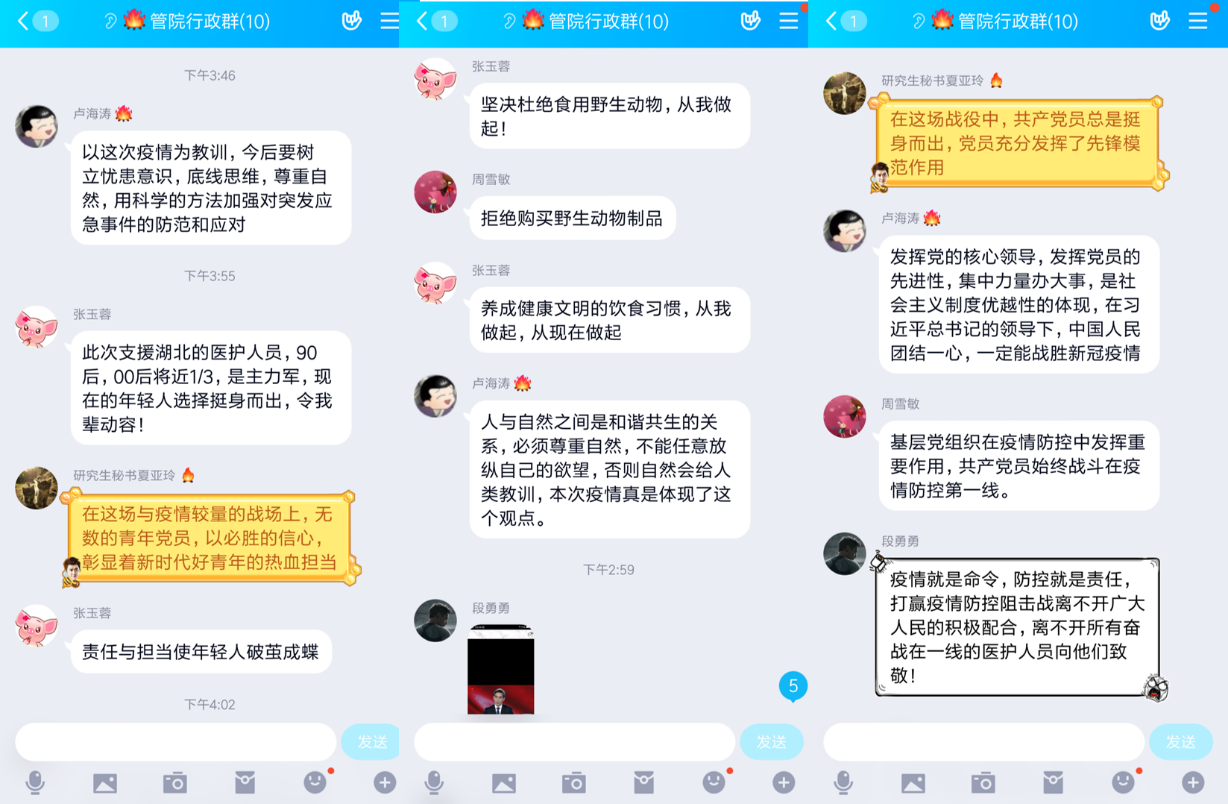 行政黨支部的10名黨員同志在線同時觀看教育部社科司與人民網聯合組織的“全國大學生同上一堂疫情防控思政大課”,因為疫情原因無法同聚一堂,黨員同志們紛紛齊聚線上,聆聽思政大課,并在QQ群中交流學習感悟。