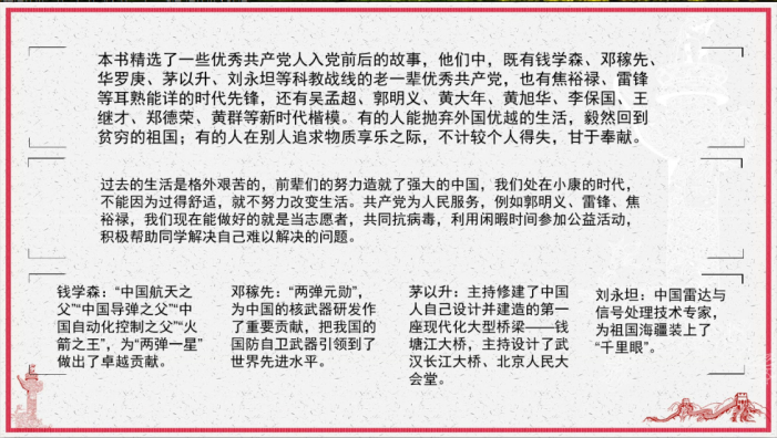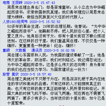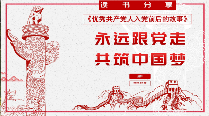 (作者:李亦娜、吳莉)近日,管理學(xué)院2018級(jí)B部第88期入黨積極分子在線上進(jìn)行了三個(gè)活動(dòng)。 2月21日、22日晚上,在線舉辦了“閱讀紅色經(jīng)典書籍”分享會(huì)。本活動(dòng)旨在營(yíng)造一個(gè)更加和諧良好的閱讀環(huán)境,從以前的革命前輩身上,感受信仰的力量。管理學(xué)院2018級(jí)輔導(dǎo)員姚亞南及管理學(xué)院22名學(xué)生參加了此次活動(dòng)。 期間,同學(xué)們根據(jù)從書籍內(nèi)容中得到的自身體會(huì)結(jié)合現(xiàn)在的社會(huì)情況一一進(jìn)行了發(fā)言。第一天的“分享之星”潘寓婷同學(xué)說(shuō):“沒有讀《青春之歌》之前,就不知道原來(lái)那個(gè)年代和我們的同齡的人生活是如此的艱難困苦。他們深知農(nóng)民階級(jí)的困苦,便從此義無(wú)反顧為之奮斗,書寫屬于他們的青春之歌”。第二天的“分享之星”趙軒同學(xué)分享了他圍繞《優(yōu)秀共產(chǎn)黨人入黨人前后的故事》中的初心與使命,探究、學(xué)習(xí)優(yōu)秀共產(chǎn)黨人如何不忘初心、牢記使命。從分享整本書的讀書感受到描述具體的兩位優(yōu)秀共產(chǎn)黨人的故事,講述了他從二十四位優(yōu)秀共產(chǎn)黨人身上獲得的啟發(fā)。姚亞南老師在分享會(huì)結(jié)束時(shí)說(shuō)道:“在這個(gè)碎片化的時(shí)代,能夠領(lǐng)略書香的味道,相信你們的內(nèi)心一定能感受到充實(shí)的力量。” 趙軒同學(xué)的演示文稿 聽完讀書分享會(huì)之后,姚亞南老師與同學(xué)們共同探討了一個(gè)話題:疫情之下,生命的意義到底是什么?當(dāng)年邁回首往事時(shí),怎么的一生才不會(huì)遺憾呢?王辰曄同學(xué)說(shuō):“生命的意義在于我們從0到0的生命旅程中,竭盡全力讓自己的價(jià)值達(dá)到最大值。”童穎同學(xué)則表示:“生命的意義在于:無(wú)悔,無(wú)愧,無(wú)悔于己,無(wú)愧與心。”同時(shí)大家也提到,在目前的疫情之下,作為當(dāng)代大學(xué)生應(yīng)該意識(shí)到在國(guó)家危急之時(shí),只有不斷的奮斗,才有足夠的能力和力量去接住時(shí)代發(fā)展的接力棒,才能不愧對(duì)那些將青春奉獻(xiàn)給社會(huì),祖國(guó)的先輩們。接著,大家也對(duì)學(xué)習(xí)、生活和人生目標(biāo)等發(fā)表了自己的看法。姚亞南老師指出,在大學(xué)這個(gè)階段,是生涯的探索期,沒有明確的目標(biāo)是正常的。但不能無(wú)所事事的虛度,要多實(shí)踐多接觸多嘗試,從中發(fā)現(xiàn)感興趣的事除了外在探索,也要注重自身的探索,歡迎同學(xué)們與之溝通交流。 3月5日,是周恩來(lái)總理誕辰122周年,同學(xué)們也在群里共同緬懷了周總理。50多年革命生涯,26年總理任期,他理想堅(jiān)定,高風(fēng)亮節(jié),功勛卓著,虛懷若谷;他是人民的“總服務(wù)員”,嘔心瀝血,鞠躬盡瘁。為中華之崛起而讀書,點(diǎn)燃了青少年的愛國(guó)之種。“愿這盛世,如您所愿。” 同學(xué)們?cè)?/span>QQ群里緬懷周恩來(lái)總理