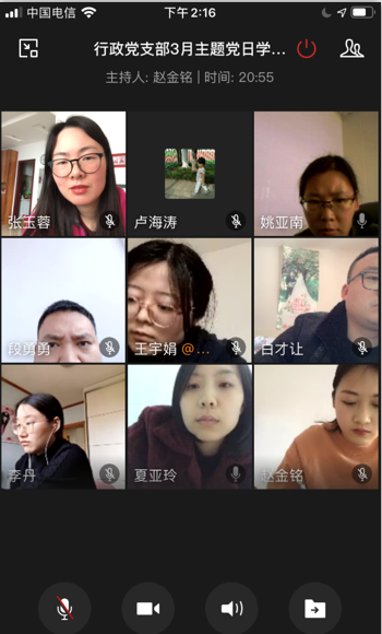 (文字作者:王宇娟)2020年3月23日下午14:00-16:00,管理學(xué)院行政黨支部積極響應(yīng)黨委組織部下發(fā)的《關(guān)于開(kāi)展2020年3月份黨支部主題黨日活動(dòng)的通知》,以“大考之中踐初心,抗疫一線黨旗紅”為主題,在周一下午召開(kāi)了3月份主題黨日活動(dòng),管理學(xué)院行政黨支部全體黨員參加此次線上會(huì)議,會(huì)議采用企業(yè)微信在線視頻會(huì)議的形式進(jìn)行,黨支部書(shū)記張玉蓉同志主持此次會(huì)議。