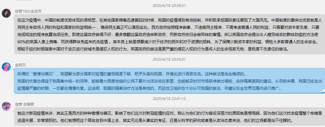 觀看這兩期視頻后,入黨積極分子們紛紛各抒己見,說出自己的體會與理解。龍英俊同學談到:“前幾天我很不解為什么一些西方國家的人會在疫情很嚴重的時候還在詆毀中國。”通過本次學習后,她分享到,“其原因歸根結底就是中西方政治體制的區別,在應對疫情的過程中,中國政府秉持人民的利益高于一切,而西方則是經濟利益和商業利益高于一切。”段會吉同學則感嘆道:“事實就是事實,抹黑中國的結果,只會把自己越抹越黑,越是攻擊抹黑中國,越是與中國的表現形成鮮明對比。”盧思懿同學說:“在看了《拒絕傲慢與偏見》后,我感受到了祖國的強大,感到很幸運身在中國。”