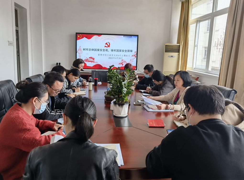 2022年4月20日下午,管理學院行政黨支部在5號樓222會議室召開以“樹牢總體國家安全觀,筑牢國家安全屏障”為主要內容的主題黨日活動?;顒佑芍Р繒涏u反修主持。
