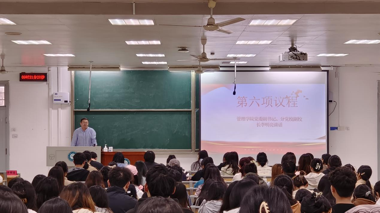 11月4日上午,管理學院2023年秋季分黨校開班儀式在15棟教學樓105教室舉行。學院黨委副書記、分黨校副校長李明亮出席開班儀式,2022級輔導員曾城皓、第96期入黨積極分子全體學員、第15期發(fā)展對象全體學員及第16期預備黨員全體學員參加開班儀式。開班儀式由2021級輔導員田堯主持。