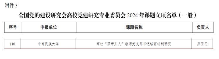 2024年12月5日,全國黨的建設研究會高校黨建研究專業委員會公布了2024年課題立項結果,財會教工黨支部書記蘇亞民教授申報的“高校‘雙帶頭人’教師黨支部書記培育機制研究”課題獲批一般項目立項。
