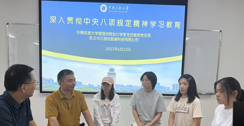 2025年6月22日,為深入貫徹中央八項規定精神學習教育,會計學系專任教師黨支部與武漢中云國創數據科技有限公司在16-222開展聯學聯建活動。湖北省“雙帶頭人”教師黨支部書記工作室負責人、會計學系專任教師黨支部書記蘇亞民、學生黨員代表與武漢中云國創數據科技有限公司咼總經理參加了此次聯學聯建活動。