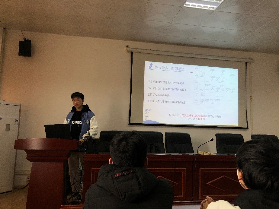 隨后,柳鑫政同學分別從“大二課程性質”、“學習方法”、“期末備考心態”三個方面為大家做了分享。柳鑫政同學為大家說明了隨著專業課的增多和難度的增加,除了課堂,還要求大家具備自學能力,主動解決問題,結合課表合理安排時間消化課堂內容。