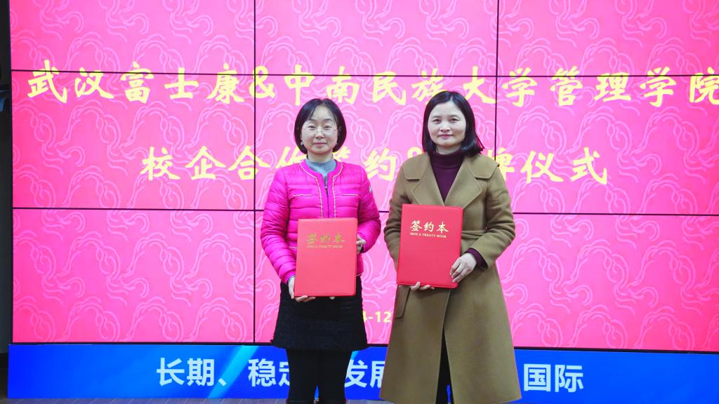 2024年12月17日下午,中南民族大學管理學院-富士康武漢科技工業園“校企共建人才培養基地”簽約及授牌儀式在富士康武漢科技工業園報告廳舉行。中南民族大學管理學院翟華云院長、毛忞歆主任、毛冠鳳副教授、校友及學生代表,富士康武漢科技工業園工會唐克誠副主席、武漢人資吳菲總監、李森部長等,共同見證了這一重要時刻。
