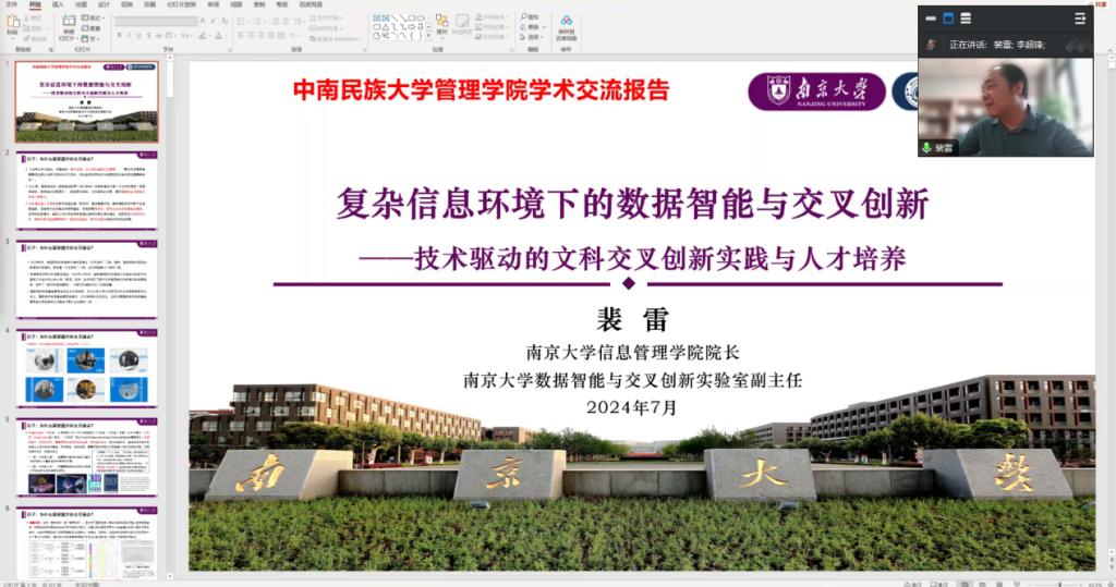 2024年7月25日上午,管理學院首場暑期“新文科.新融合.新管理”系列講座開講。南京大學教授、博士生導師、信息管理學院院長裴雷教授受邀到我院開展主題為《復雜信息環境下的數據智能與交叉創新》的講座。此次講座線上進行,由李超鋒副院長主持,管理學院師生參加會議。