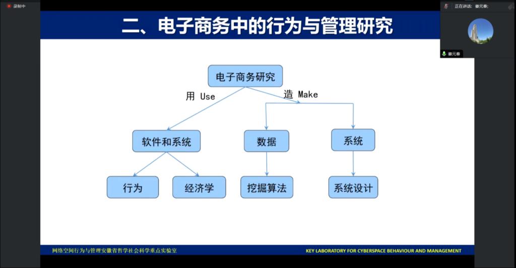 姜元春教授首先介紹了自己團(tuán)隊(duì)的整體研究情況,并簡(jiǎn)單介紹網(wǎng)絡(luò)空間行為與管理實(shí)驗(yàn)室的創(chuàng)立背景與基本情況。姜教授開(kāi)篇講到:以互聯(lián)網(wǎng)為代表的信息技術(shù)日新月異,引領(lǐng)了社會(huì)生產(chǎn)新變革,拓展了國(guó)家治理新領(lǐng)域。談到網(wǎng)絡(luò)空間,大家首先想到的是信息傳播等方面內(nèi)容,但網(wǎng)絡(luò)空間同時(shí)也是生產(chǎn)生活的新空間和經(jīng)濟(jì)發(fā)展的新引擎,總結(jié)來(lái)說(shuō)前者代表網(wǎng)絡(luò)信息的相關(guān)研究,后者代表電子商務(wù)的相關(guān)研究。姜教授團(tuán)隊(duì)將網(wǎng)絡(luò)空間分為兩大類:電子商務(wù)和全媒平臺(tái)。本次講座主要介紹電子商務(wù)領(lǐng)域的研究,電子商務(wù)在推動(dòng)我國(guó)經(jīng)濟(jì)數(shù)字化轉(zhuǎn)型、引領(lǐng)數(shù)字經(jīng)濟(jì)發(fā)展等方面發(fā)揮著越來(lái)越關(guān)鍵的作用,是我國(guó)經(jīng)濟(jì)高質(zhì)量發(fā)展新動(dòng)能。姜教授提到現(xiàn)在的網(wǎng)絡(luò)平臺(tái)和以前是不一樣的,現(xiàn)在網(wǎng)絡(luò)空間中除了有個(gè)人、群體、企業(yè)、平臺(tái)、監(jiān)督平臺(tái)之外,還有很多智能算法,形成了復(fù)雜的人機(jī)交互的管理場(chǎng)景,所以網(wǎng)絡(luò)空間管理面臨著安全、公平、可信、可控這四個(gè)方面的挑戰(zhàn)。