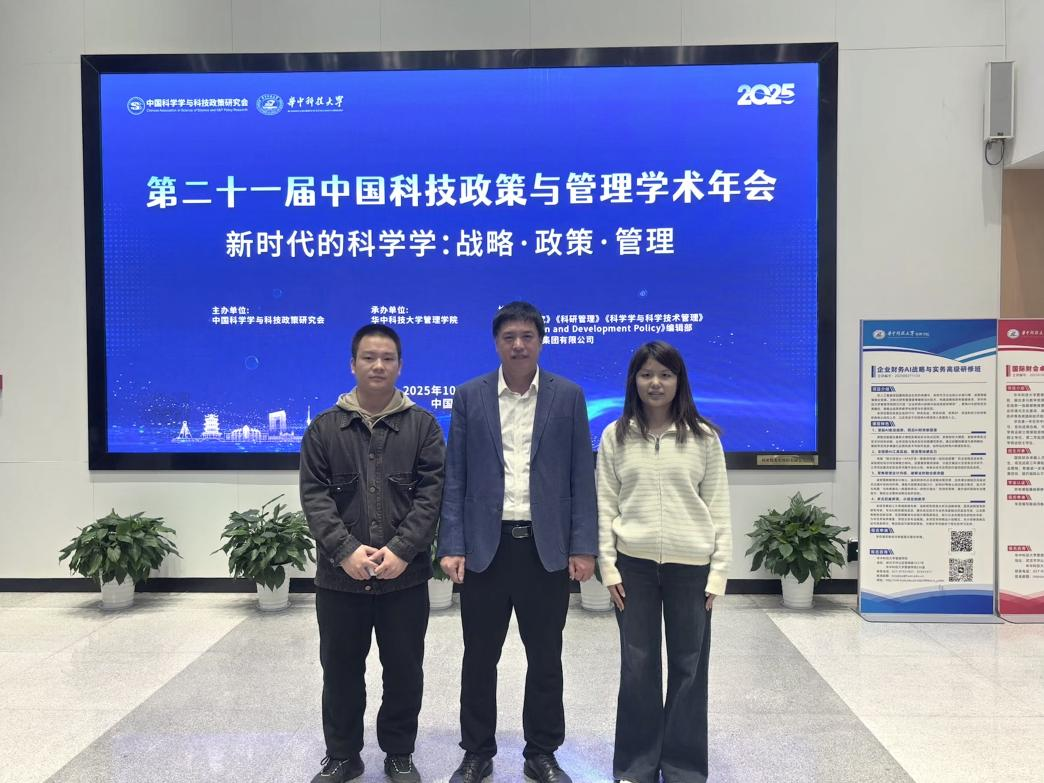 20251024-26,備受矚目的第二十一屆中國科技政策與管理學術年會在華中科技大學隆重舉行。本次會議匯聚了國內外該領域的頂尖學者與科研新銳,共同最新研究進展與發展趨勢。我院潘澤江教授和研究生王林順、完世琪應邀出席本次學術盛會,潘澤江教授作為特邀嘉賓做大會報告,同時擔任分會場評議人,展現了我校在該領域的學術影響力與活力。