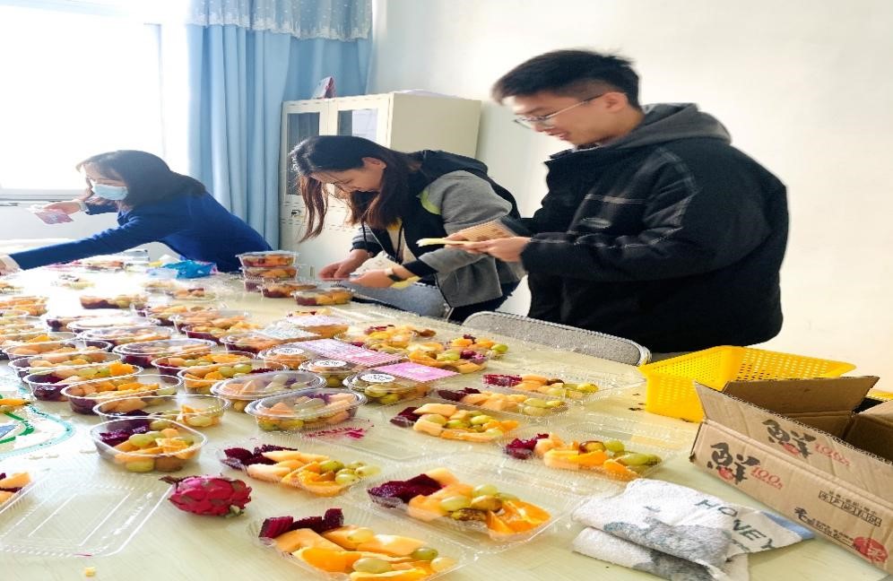 當(dāng)天上午,志愿者同學(xué)們把采購來的水果進(jìn)行切洗,分裝,每一份水果附上了同學(xué)手寫的考研鼓勵賀卡。經(jīng)過一上午的精心準(zhǔn)備,完成了共計60份的水果拼盤,有橙子、棗子、火龍果、葡萄等水果。寓意著考研“橙”功、“棗”日上岸,“葡”匐前行。